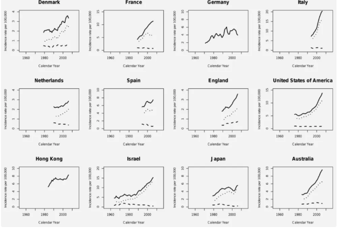 1960 年至 2007 年,在不同國家和地區(qū),男性甲狀腺癌發(fā)病率的總體趨勢呈明顯上升,圖片來源:參考文獻(xiàn)[4]